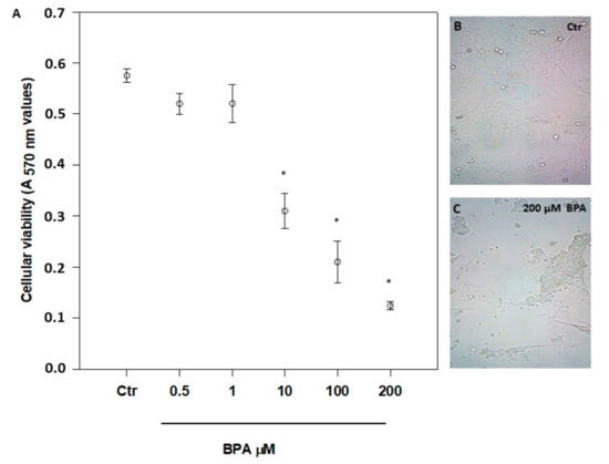 Effect of increasing concentrations of BPA on mouse Sertoli cell viability (A), and morphology (B,C), after 48 h of treatment. Magnification, ×200. Data are expressed as means ± SEM of 5 independent experiments. * p < 0.01 vs. vehicle-treated controls (Ctr).