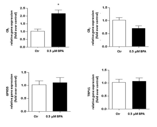 Effect of BPA (0.5 μM for 48 h) on mRNA levels of eCB-binding receptors (CB1, CB2, GPR55 and TRPV1) in exposed Sertoli cells, compared to vehicle-treated controls (Ctr). Gene expression is reported as 2−ΔΔCt values calculated by ΔΔCt method vs. Ctr, posed equal to 1.0. Expression levels of each gene were normalized to β-actin, and data were expressed as means ± SEM of 5 independent experiments. * p < 0.01 vs. Ctr.