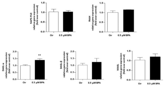 Effect of BPA (0.5 μM for 48 h) on mRNA levels of eCB metabolic enzymes (NAPE-PLD, FAAH, DAGL-α, DAGL-β and MAGL) in exposed Sertoli cells, compared to vehicle-treated controls (Ctr). Gene expression was reported as 2−ΔΔCt values calculated by ΔΔCt method vs. Ctr, posed equal to 1.0. Expression levels of each gene were normalized to β-actin, and data were reported as means ± SEM of 5 independent experiments. ** p < 0.05 vs. Ctr.