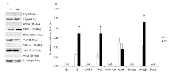 In these experiments, the effects of BPA (0.5 μM for 48 h) on protein expression of eCB system components were evaluated. As shown in Figure 4, in comparison with untreated controls Sertoli cells exposed to BPA expressed significantly higher levels of CB2 (+140%), TRPV1 (+250%), and DAGL-β (+130%) proteins (in all these cases: p < 0.05 vs. Ctr), and a trend towards reduced FAAH (−15%; p > 0.05 vs. Ctr). Conversely, CB1, GPR55, NAPE-PLD, DAGL-α and MAGL proteins in all cases were undetectable under our experimental conditions (p > 0.05).