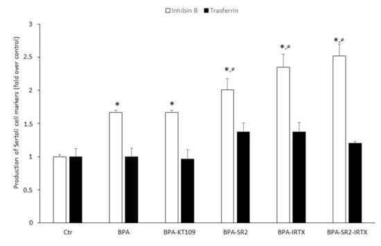 Sertoli cells were cultured for 48 h, in the presence of vehicle (Ctr) or of BPA, alone or supplemented with 1 μM of: (a) KT-109; (b) SR144528 (SR2); (c) IRTX; or (d) the combination IRTX + SR2. Protein expression of inhibin B and transferrin was determined by enzyme linked immunosorbent assay (ELISA), as reported [89]. Briefly, wells were coated with Sertoli cell lysates (20 µg/well) in coating buffer (0.05 M Na2CO3, pH 9.6) for 2 h at room temperature. Then, they were incubated with 1% bovine serum albumin (BSA) in phosphate-buffered saline (PBS) for 1 h, and then for 2 h with anti-transferrin or anti-inhibin B polyclonal antibodies diluted to 1:500 and 1:1000, respectively, with 1% BSA in PBS. In preliminary experiments, these antibodies were found to recognize a single immunoreactive band in Sertoli cell extracts, of the molecular weight expected for inhibin B (45 kDa) and transferrin (77 kDa), respectively. After rinsing three times with 1% BSA in PBS-Tween 20, 100 µl horseradish peroxidase (HRP)-conjugated secondary antibody (diluted 1:5000) were added, and the ELISA plate was further incubated for 1 h at room temperature. Afterwards, enzymatic activity of HRP was determined by adding 100 µl/well of ABTS, then stopped with 100 µl of stop solution (1% SDS), and finally absorbance at 405 nm was measured in a Multiskan ELISA Microplate Reader (ThermoLabsystems, Bevery, MA, USA). The linearity ranges of ELISA against inhibin B and transferrin were ascertained by dose-dependence curves with different amounts (0–40 µg/well) of Sertoli cell extracts. All data were within these linearity ranges, and were expressed as fold increase over controls, posed equal to 1.0.