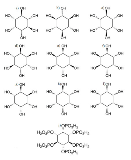 Structural formulas of (a) myo-inositol (MI); (b) scyllo-inositols (Ins); (c) mucco-Ins; (d) D-chiro-Ins; (e) L-chiro-Ins; (f) neo-Ins; (g) allo-Ins; (h) epi-Ins; (i) cis-Ins; and (j) phytic acid (IP6).