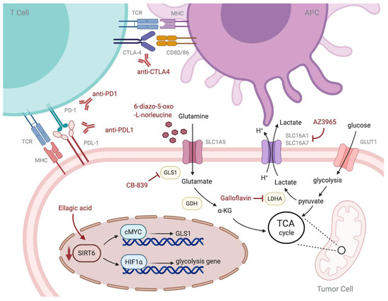 In 1923, Warburg et al. observed that tumor cells exhibit high glucose uptake and favor glycolysis as an energy supplement, even with sufficient oxygen, which was coined as the Warburg effect [81,82,83,84]. However, glycolysis is also required by T cells, macrophages, and APCs; therefore, competitive TME impairs these immune cells by limiting their glycolytic capacity. Sirtuin 6 (SIRT6), a nicotinamide adenine dinucleotide (NAD+)-dependent deacetylase, is involved in glucose homeostasis as an epigenetic regulator. SIRT6 deficiency stimulates hypoxia-inducible factor 1α (HIF1α) activity, which increases the expression of glycolysis-related genes, such as lactate dehydrogenase (LDH), glucose transporters (GLUTs), and pyruvate dehydrogenase kinases (PDKs) [85,86,87]. Several studies have revealed that various human cancers, especially pancreatic and colorectal cancer, are SIRT6-deficient, and restoring SIRT6 activity might be a promising therapeutic strategy in these cases [88,89,90]. Ellagic acid, a common polyphenol in berries, had been reported to have an anti-proliferative effect on human colon adenocarcinoma cells by inhibiting glycolysis via increasing the deacetylase activity of SIRT6 [91,92,93]. This suggests that targeting SIRT6 activity might be a new insight into the development of anti-cancer therapies. According to the Warburg effect, tumor cells favor glycolysis, which leads to excessive lactate formation even under sufficient oxygen. Lactate, the main metabolite of tumor cells and cancer-associated fibroblasts, is largely accumulated in the TME and has been seen as one of the key components driving immunosuppression and favoring tumor growth [94,95,96,97]. Growing evidence indicates that the proton-coupled lactate efflux from cancer cells or stromal cells preserves the acidic phenotype and increases tumor progression by modulating the TME, which includes cell invasion, angiogenesis, survival signaling, and escaping immune surveillance.