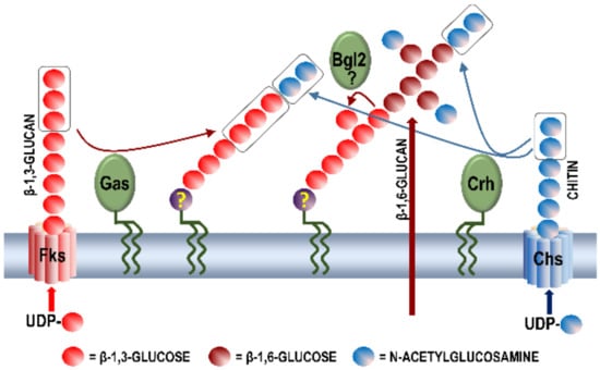 Since the β-1,3-glucan molecules consist of very long chains of up to 1500 glucose units, it is difficult to envisage that such long chains could be made without eventually blocking the enzymatic activity of glucan synthase. Indeed, there is evidence that proteins of the Gas family possess the transglucosidase activity and that they transfer portions of the β-1,3-glucan protruding from the glucan synthase to the already synthesized glucan chain, liberating in this way the enzyme for further elongation of the glucan chain (Figure 1). How, or if at all, β-1,3-glucan chains are anchored to the cell membrane is still not known. Speculations that the putative anchor moiety involves a glycolipid or a membrane protein have never been experimentally corroborated. Another opened question is whether β-1,3-glucan chains are somehow covalently cross-linked to form a network similar to the bacterial peptidoglycan. A putative cross-linker should be a bivalent molecule able to connect two glucan chains, thus it could not be a carbohydrate. It has been proposed that some proteins that are covalently attached to glucan can form more than one link, bridging different carbohydrate chains [21]. However, knockouts of corresponding genes did not bring about the expected phenotype. Thus, this question still remains open.