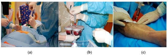 The protocols for autologous cell therapy use a broad spectrum of techniques for cell concentration. However, all used methods work similarly. They use a source material rich in pluripotent cells obtained from the patient’s BM (either from BM directly or after mobilizing them into the peripheral circulation). They concentrate mononuclear cells into a preparation suitable for injection application into the ischemic limb, (Figure 2a). After bone marrow aspiration (typically in a volume of 240 mL), the sample is treated with EDTA anticoagulation and subsequently separated for 15 min with gradient-density centrifugation, (Figure 2b). After centrifugation, the component rich in BM-MNC is aspirated. The isolate intended for PAD treatment is applied deep into the intramuscular space, along the presumed course of the affected limb’s crural arteries and into the surrounding area of the defect, (Figure 2c).
