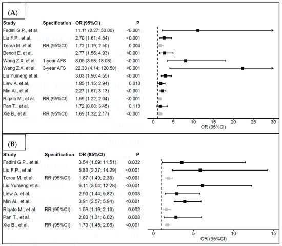 “Primary endpoints” evaluating the efficacy of non-option CLI treatment using the cell concentrate. The forest plots present (A) the odds ratios for nonamputation and (B) wound healing, respectively, for the group of patients treated with cell therapy. (OR = odds ratio, RR = risk ratio, 95%CI = 95% confidence interval, AFS = amputation-free survival.)