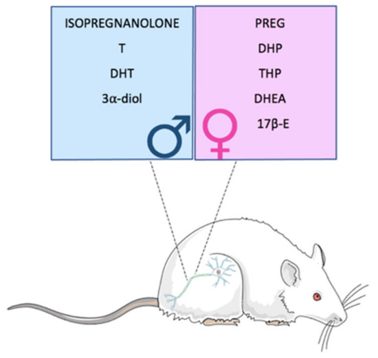 In physiological conditions, neuroactive steroid levels present sex differences, not only as expected in plasma levels, but also in different brain areas, in the cerebrospinal fluid (CSF), and in peripheral nerves (e.g., the sciatic nerve). For instance, the levels of PREG are higher in the CSF, cerebral cortex, hippocampus and cerebellum of male rats, with respect to females, while the same neuroactive steroid shows elevated levels in the spinal cord and plasma of females in the diestrous phase [35]. In addition, in the sciatic nerve, neuroactive steroid levels showed sex differences (Figure 2). In particular, levels of PREG, DHP, THP, DHEA and 17β-estradiol are higher in the sciatic nerve of females than in the males while the levels of isopregnanolone, T, DHT and 3α-diol are higher in the male sciatic nerve [35].