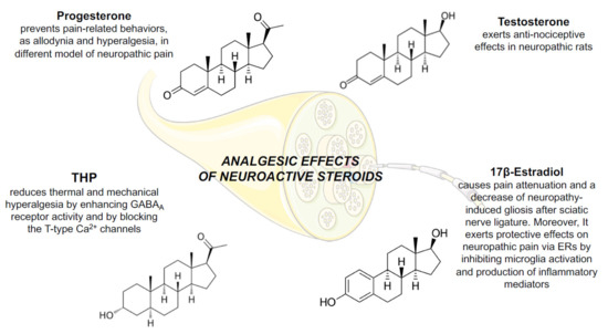 Similarly, THP plays an important role in pain modulation. As mentioned above, this steroid is a positive allosteric modulator of GABAA receptors [169] and, indeed, probably by this mechanism, it reduces thermal and mechanical hyperalgesia after sciatic nerve ligature [170].
