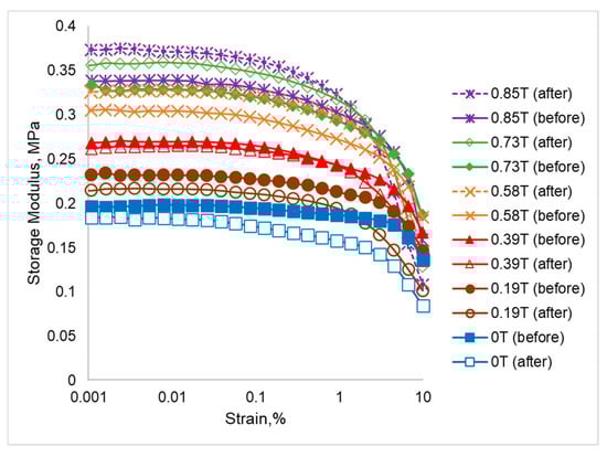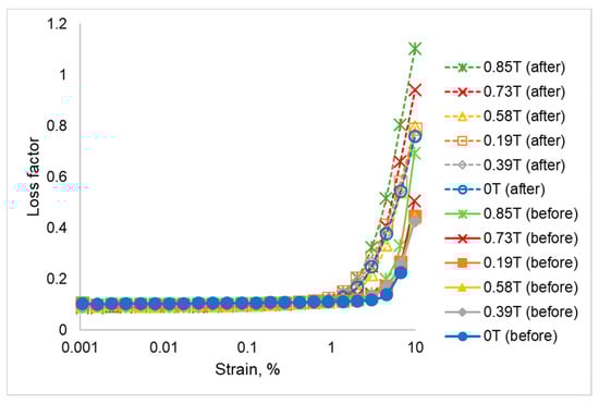 | Magnetic Field | Minimum Loss Modulus (MPa) | Maximum Loss Modulus (MPa) | ||