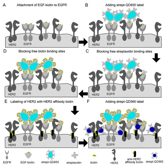 Schematic representation of the labeling procedure for epidermal growth factor receptor (EGFR) and human epidermal growth factor receptor 2 (HER2) receptors in fixed cancer cells. (A) First, epidermal growth factor (EGF) with a single conjugated biotin molecule was incubated after which (B) streptavidin conjugated quantum dots 655 (streptQD655) were attached. (C) Intermediated blocking steps with free streptavidin and (D) biotin solution were applied to saturate any remaining free biotin or streptavidin binding sides from the EGFR-QD655 label. For HER2 labeling, (E) first, an HER2 specific mono-biotin conjugated Affibody was attached to the extracellular domain IV of HER2, then (F) streptQD565 was attached.