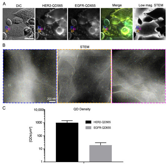- Peckys, D.B.; Quint, C.; Jonge, N. Determining the Efficiency of Single Molecule Quantum Dot Labeling of HER2 in Breast Cancer Cells. Nano Lett. 2020, 20, 7948–7955. [Google Scholar] [CrossRef] [PubMed]