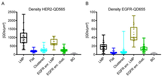 Besides the LMPs, positive HER2 expression was also observed on smaller membrane deformations (see, for example, Figure 3 and Figure 4, Supplemental Figure S8). These HER2 clustered regions, have been described for HER2 overexpressing breast cancer cell lines and patient samples [37,59]. In contrast to LMPs, neither active HER2 signaling, nor the formation of EGFR-HER2 or HER2-HER3 dimers are required for the formation of these membrane deformations but are the consequence of the increased amount of HER2 receptors being present at the membrane [37]. Compared to LMPs, the observed labeled HER2 densities for the clustered regions was almost a factor of four lower ((2.7 ± 1.2) × 102 QDs/µm2 vs. (9.9 ± 4.5) × 102 QDs/µm2) (Figure 5A and Table 1). The clustered regions can, therefore, be considered as the default arrangement of HER2 receptors in the cell membrane being overexpressed as is the case on SKBR3 cells and its formation being independent of EGFR expression. This finding is further supported by the fact that for the clustered regions EGFR expression was very low (Table 1).