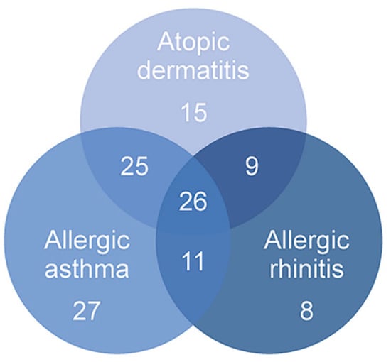 Number of individuals presenting overlapping conditions of the atopic march. Overall, 75 individuals presented atopic dermatitis, 89 had allergic asthma and 54 had allergic rhinitis. Several of these individuals had overlapping conditions, highlighting the increased risk of presenting an allergic disease as allergic asthma or allergic rhinitis if an individual has atopic dermatitis.