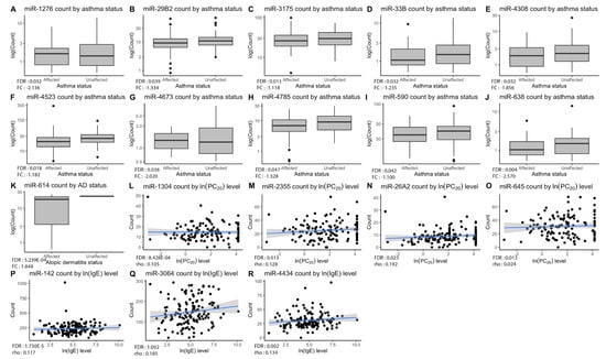 Significant pri-miRNA expression counts by phenotypes. Plots (A–J) show down-regulation of ten pri-miRNAs in asthmatic patients compared to non-asthmatics, while plot (K) shows up-regulation of miR-614 for individuals with atopic dermatitis in comparison with unaffected ones. As for plots (L–O), they display positive correlations between miRNAs and PC20 levels. Lastly, plots (P–R) show positive correlation between miRNAs and IgE levels. Overall p-value of the analysis is in lower-left corner of each graph with corresponding fold change or Spearman’s rho value.