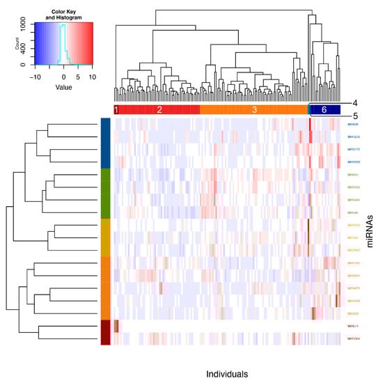 Clustering of individuals according to significant pri-miRNAs counts. Individuals were clustered according to expression counts from the 18 associated miRNAs using Ward’s method on Euclidian distances. Six clusters were then obtained by visual inspection of the dendrogram and confirmed with the NbClust package in R.
