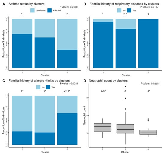 Moreover, looking at Figure 4 and according to post-hoc analyses, cluster 2 was associated with higher rates of diagnosis of asthma as compared with cluster 6 (p-value = 0.027). Cluster 3 was less related to familial history of respiratory diseases as clusters 2 (p-value = 0.033) and 6 (p-value = 0.034). Cluster 6 also had a stronger association with familial history of allergic rhinitis when compared with clusters 2 (p-value = 0.009) and 3 (p-value = 0.003). Finally, cluster 2 had a higher neutrophil count in comparison with clusters 3 (p-value = 0.035) and 6 (p-value = 0.005).