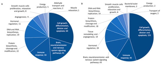 In order to better understand underlying mechanisms explaining associations observed between pri-miRNA expression and diseases of the atopic march or clinical measures, correlations were performed to identify possible gene targets. miRNA–gene target pairs with false discovery rate (FDR)-values inferior to 0.05 and absolute correlation coefficients >0.2 were deemed significant and further validated using miRTArBase v8.0 []. A total of 540 validated miRNA–gene target pairs were found using negative correlations and 663 using positive correlations. According to the inhibition function of miRNAs, results of negative correlations are usually prioritized. However, a recent study highlighted the mechanisms underlying positive correlations with gene targets, such as in feedback loops and co-transcription of intronic miRNAs and their host genes [], motivating the presentation of positive correlations in this study. The top 25 best negative and positive correlations are displayed in Table S2. They were then classified into PANTHER biological pathways []. Among the gene targets identified, 215 from the negative correlations and 353 from the positive ones have been successfully classified by PANTHER. Biological pathways identified were grouped into more general categories shown in Figure 5 (see Table S3 for the list of PANTHER pathways in each general category).