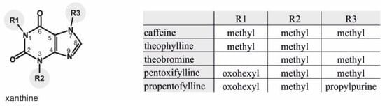 - Muller, C.E.; Jacobson, K.A. Xanthines as adenosine receptor antagonists. In Methylxanthines; Handbook of Experimental Pharmacology; Springer: Berlin/Heidelberg, Germany, 2011; Volume 200, pp. 151–199. [Google Scholar]