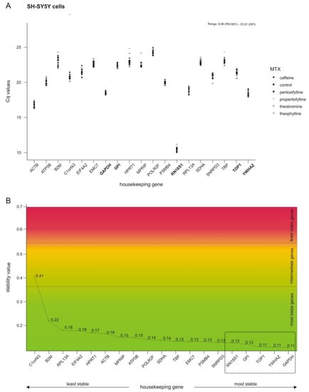 - Penna, I.; Vella, S.; Gigoni, A.; Russo, C.; Cancedda, R.; Pagano, A. Selection of candidate housekeeping genes for normalization in human postmortem brain samples. Int. J. Mol. Sci. 2011, 12, 5461–5470. [Google Scholar] [CrossRef] [PubMed]