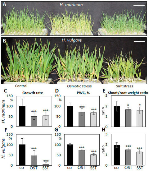 To evaluate differences in the response of H. vulgare and H. marinum to SST and to elicit salinity adaptation responses in halophytic seaside barley, the plants were cultivated in hydroponic culture containing 300 mM NaCl, which corresponds to slightly over 500 mOsm osmotic pressure. Preliminary OST experiments showed deleterious effects on plants after treatment with the same osmotic pressure (32% PEG6000), probably due to impermeability of this osmotic agent through cell membranes. Therefore, plants were cultivated in media supplemented by 15% PEG6000, which plants could still tolerate. SST and OST treatments affected the growth of both H. vulgare and H. marinum plants, albeit to a different extent (Figure 1). The relative growth rate (RGR) of H. marinum plants was approximately 2-fold lower under either SST or OST conditions (Figure 1C). A similar decrease in the RGR of H. vulgare plants was observed under OST; however, application of SST resulted in a ~95% reduction of growth rate relative to the control (Figure 1F). Under high salinity, the H. vulgare plants exhibited leaf chlorosis and wilting as marks of severe salt toxicity, whereas the H. marinum plants maintained their strong green color (Figure 1A,B). Under OST, however, they turned a yellow shade. Furthermore, after SST, the osmotic pressure recorded in H. marinum plants was slightly lower than that in H. vulgare (Figure S1).