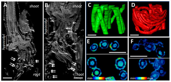 Comparative non-invasive magnetic resonance imaging (MRI) revealed structural changes in SST roots of H. marinum when compared to the control. (A,B) The representative virtual cross-sections show the internal structure of hypocotyl regions of plants growing under the control condition (A) and SST (B). Numerous root nodules in the hypocotyl region (white arrows) and root cross-sections (doubled arrows) are visible. (C,D) Fragments of the 3D models show spatial arrangement of the fibrous roots in control (C, green) and SST (D, red). (E,F) Relative differences in water distribution across the root tissues are visualized in virtual cross-sections of control (E) and SST (F) roots. MRI signal in (E,F) is at an identical scale and represented using a rainbow-based color scheme. High signal intensities in red (max) indicate high water saturation, while the blue regions (min) indicate lower water saturation. Scale bars = 1 mm.