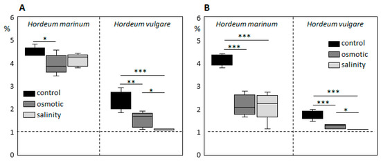 Seeds of seaside barley (Hordeum marinum ssp. marinum), originated from Tuscany region, and cultivated barley (Hordeum vulgare) cv. Golden Promise were germinated on moist filter paper in the dark at 20 °C. Seven day-old seedlings were transferred on hydroponic half-strength Hoagland’s No. 2 solution (Sigma-Aldrich, St. Louis, MO, USA) and incubated in the growth chamber under irradiance of 350 mmol m−2 s−1, 12 h photoperiod, and 20 °C. Due to the halophytic nature of H. marinum, 0.2 mM NaCl was added to the control incubation solution [15]. The incubation solution was fully replaced every week by a newly prepared one in order to prevent nutrient depletion. After 14 days of growing, plants were exposed stepwise to the increasing concentrations of 50 mM NaCl or 2.5% PEG6000 per day until 300 mM NaCl (salinity stress) or 15% PEG6000 (osmotic stress) were reached. Control plants were exposed to 0.2 mM NaCl continuously. All plants were sampled after five days (32 days old) of maximum stress and separated into shoot (crown and growing point) and root (2 cm root tips) fractions. To average the genetic background and local environmental influences, a bulk of 10–15 plants, grown in a single hydroponic tank either under the control or stress conditions, were collected for one biological replication. In total, 10 biological replications were harvested, frozen, and used in further analyses.