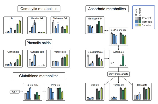 Levels of mevalonate pyrophosphate, involved in the mevalonate pathway of terpenoid backbone biosynthesis [25], were decreased in all tissues, particularly in roots under SST (Table S1). The content of methylerythritol-4P (MEP), part of the MEP pathway of terpenoid synthesis, decreased in shoots under both types of stress (Table S1). Distinct components of the shikimate pathway (e.g., quinic acid and shikimate-3P) were significantly reduced under OST. Tyramine content, a product of tyrosine metabolism and a precursor in alkaloid biosynthesis via the shikimate pathway, was decreased in the roots under both types of stress (Table S1).