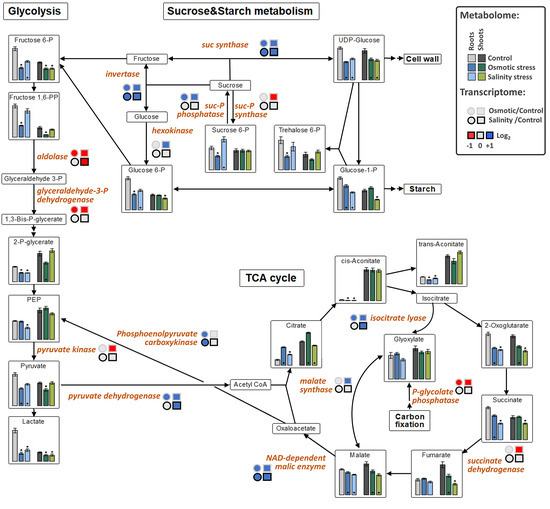 The effect of osmotic and salinity stresses on the sugar and central metabolism and corresponding transcriptomic changes in roots and shoots of Hordeum marinum. Metabolic data, presented as bars, are means ± SE; n = 7. Significant differences to control treatments at specified time points after excision are indicated by *, p < 0.05 (Wilcoxon, Mann-Whitney U-test). Up-regulated genes are labeled by blue, down-regulated by red color.