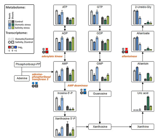 The effect of osmotic and salinity stresses on the purine catabolism and corresponding transcriptomic changes in roots and shoots of Hordeum marinum. Metabolic data, presented as bars, are means ± SE; n = 7. Significant differences to control treatments at specified time points after excision are indicated by *, p < 0.05 (Wilcoxon, Mann-Whitney U-test). Up-regulated genes are labeled by blue, down-regulated by red color, and those with no changes in expression by grey color.