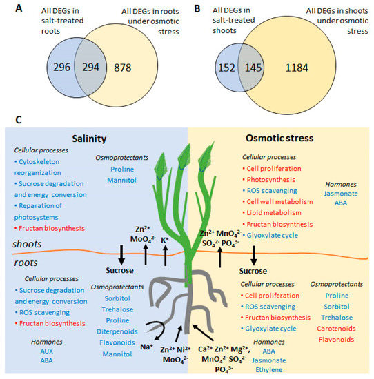 (A,B) Venn diagram showing the numbers of common and stress-specific differentially expressed genes (DEG) in roots (A) and shoots (B) after osmotic (15% PEG6000) and salt (300 mM NaCl) stresses. (C) A schematic overview of the main processes occurred during salinity and osmotic stress in H. marinum. Activated processes are highlighted in blue, inhibited processes are highlighted in red. Arrows indicate directions of mineral, phytohormone, and sugar redistribution between roots and shoots upon stress treatment.