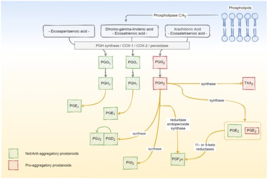 This prostaglandin derives from omega-3 fatty acids and is synthesized by COX from eicosapentaenoic acid (EPA) [175,176]. It was reported to have anti-proliferative effects in different cancer cells [176], is involved in tumor angiogenesis [177] and can influence endothelial cell integrity [178,179]. A study by Iyu revealed a reduced platelet aggregation (PAF-induced) and expression of plasma membrane P-Selectin (U46619-induced) when platelets of human origin were treated with PGE3. These effects were concentration-dependent and enhanced when an EP3 receptor antagonist was applied additionally. In contrast, effects were inhibited when the EP4 receptor was antagonized, but were not influenced by an IP receptor antagonist. The overall influence of PGE3 on platelet function is consequently balanced by EP3 and EP4 receptor activation, which is in accordance with the PGE2 (EP3) but not the PGE1 (IP) receptor routes. These data indicate a potential mechanism of how omega-3 fatty acids—the precursors of PGE3—might influence platelet function [180,181,182]. At present, too little data is available on this aspect.