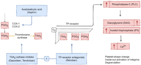 Limitations of this approach could be reduced through the combined administration of TXA2 synthase inhibitors and TP receptor antagonists (e.g., Terutroban and Ifetroban) [54,55]. The latter were shown to reduce TXA2 (or precursors)-induced platelet aggregation and shape change in patients in a comparable manner to Aspirin [56,57].