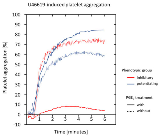 Prostaglandin-E2 has been reported to have a biphasic effect on platelet activation. It potentiates, e.g., the U46619-iduced platelet aggregation, at lower concentrations (e.g., 0.1–10 μmol/L) and inhibits it at higher concentrations (e.g., >10 μmol/L) (see Figure 4) [66,67,68,69]. However, alone, it is not sufficient to induce platelet aggregation as a consequence of the strong counteracting AC stimulation of other prostanoids [70].