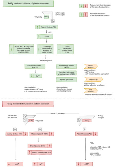 Schematic overview of the molecular pathways responsible for PGE2-mediated inhibition (PGE2 concentration > 10 µmol/L, via EP2- and EP4-receptors) and stimulation (PGE2 concentration < 10 µmol/L, via EP3- receptor) of platelet activation. The inhibitory pathways comprise activation of AC and increase of cAMP. This induces CalDAG-GEFI, EPAC and PKA signaling, which results in the phosphorylation of different proteins as well as (plasma membrane) receptors and the downregulation of calcium mobilization. Processes inducing platelet activation comprise downregulation of AC and upregulation of PLC. These processes result in the reduction of cAMP and in an elevated calcium mobilization and secretion through DAG and IP3 activation. The EP3- and P2Y12-receptors share the Gi pathway. Through this common pathway, PGE2 can potentiate the P2Y12-receptor-mediated and ADP-induced AC inhibition and, furthermore, compensate P2Y12 inhibition to a certain extent.