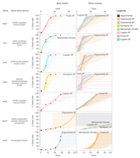 Prediction of mortality during quiescence using nonlinear models. Examples of data showing the selection procedure used for the optimal nonlinear model (Logistic 3P, Mechanistic Growth, Gompertz 3P, Logistic 5P, Exponential 3P, Exponential 2P, or Probit 4P) (see Section 4 and Figure S3). The left panel shows the experimental data of mortality measured at different time points in the nitrogen-depleted cultures and the curve fit of the optimal nonlinear model that was applied. The right panel shows the curve fit of the other tested nonlinear models.
