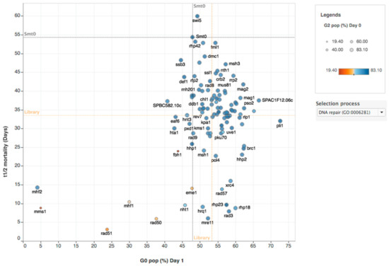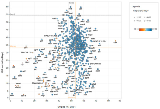 The extrapolated results using the nonlinear models are depicted together with the percentage of G2 cells at time 0 and the percentage of G0 cells after one day of starvation as a multiphenotypic representation for 684 haploid mutants of the library (Figure 3 and Table S1). It was clear that most of the analyzed strains showed similar half-time mortality curves compared to the control strain (smt-0 wild-type) with values for T1/2 > on average about 35 days for the entire library. However, for a substantial fraction of the library strains, high mortality phenotypes could be observed before or after the transition to G0.
