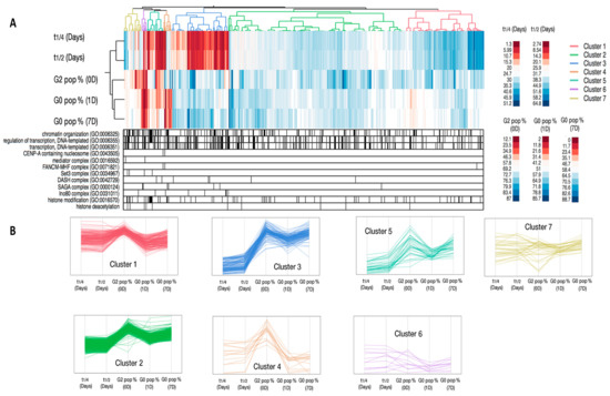 Next, we used the following five different phenotype measurements for clustering of the mutant data: extrapolated 50% and 25% of cell mortality time points, the G2% at time 0, the G0% after 1 day and 7 days of nitrogen starvation. The five datasets were subjected to hierarchical clustering, resulting in seven distinct clusters representing similar phenotypic patterns. Thus, these seven clusters represent sets of gene deletions of genes encoding chromatin factors with similar quiescence phenotypes (Figure 4A,B and Figure S4). Investigation of the cluster profiles showed a weaker or miscellaneous phenotypic behavior in some of them (cluster 1, 6, and 7). Therefore, we focused the following analysis only on the gene clusters that were clearly required for maintenance of viability during quiescence (clusters 2 and 3) and for efficient quiescence entry into G0 (clusters 4 and 5). The details of all genes in the seven clusters are shown in Table S1.