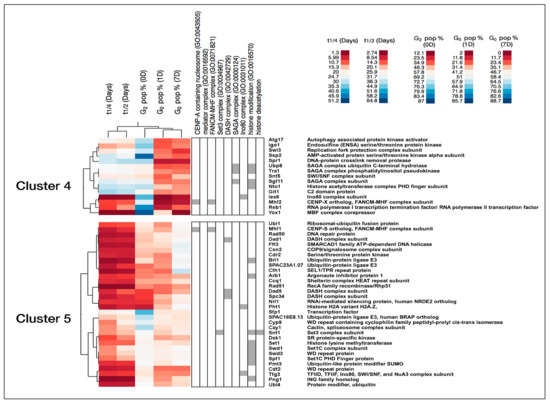 Using the hierarchical clustering results, we first analyzed the step of entry into quiescence. It was clear that cluster 4, containing 15 genes, had a strong defect in the entry into G0 stage (Figure 4A,B). Interestingly, three genes, encoding Ubp8, Tra1, and Sgf11 subunits of the SAGA complex, were significantly enriched (15.2-fold enrichment, p = 6.4 × 10−4) in this cluster (Figure 5 and Table S2). This suggests an essential role for the SAGA complex in entry into quiescence (see Section 3).