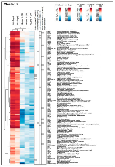 Next, we used the clustering approach to investigate the chromatin regulatory gene functions needed for viability during G0. Clusters 2 and 3 showed a relatively high G0 percentage at day 1 and mild or strong mortality phenotypes (i.e., short T1/2 and T1/4 values) (Figure 4A,B and Figure S4). To examine the gene functions in these clusters in more detail, we used gene ontology analysis (Table S2). For cluster 2, we found six genes encoding proteins in the Clr6 histone deacetylase complex (the large Rpd3 complex of S. pombe) as being significantly enriched (1.8-fold enrichment, p = 4.6 × 10−2). Regarding cluster 3, we identified five genes encoding components of the Ino80 chromatin remodeling complex (3.2-fold enrichment, p = 1 × 10−2), four genes encoding subunits of the kinetochore associated DASH complex (2.8-fold enrichment, p = 3.2 × 10−2), and two genes encoding parts of the RNA-induced transcription silencing (RITS) complex (6.3-fold enrichment, p = 2.5 × 10−2) as being significantly enriched. Thus, these complexes are important for viability when cells are maintained in quiescence and not important for viability during the vegetative cell cycle or entry into quiescence. Gene deletion belonging to cluster 3 showed stronger mortality phenotypes compared to those in cluster 2 (Figure S4).
