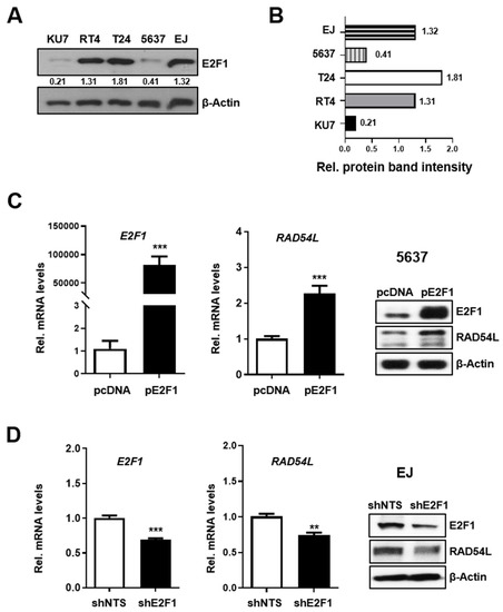Proteins from BC cells were lysed with RIPA buffer containing Complete Easy pack protease inhibitor cocktail tablets (04693116001, Roche, Mannheim, Germany). Protein concentration was determined using BCA Assay (#23227, Thermo Scientific, Rockford, IL, USA [47]) following the manufacturer’s instructions. Antibodies used in western blot were used to target E2F1 (A300-765A, Bethyl Laboratories, Montgomery, TX, USA), RAD54L (ab10705, Abcam), and β-Actin (#4967, Cell Signaling, Danver, MA, USA). Immunoreactivity was detected using a WesternBrightTM ECL reagent (K-12045-D50, Advansta, CA, USA) with HRP conjugates. Films were exposed at multiple time points to ensure that images were not saturated (47410 19291, Fuji Medical X-Ray Film, Tokyo, Japan). A ChIP assay was performed according to previous studies [30]. The indicated ChIP-qRT PCR primer sets (Table S1) were used to amplify DNA fragments by qRT-PCR.