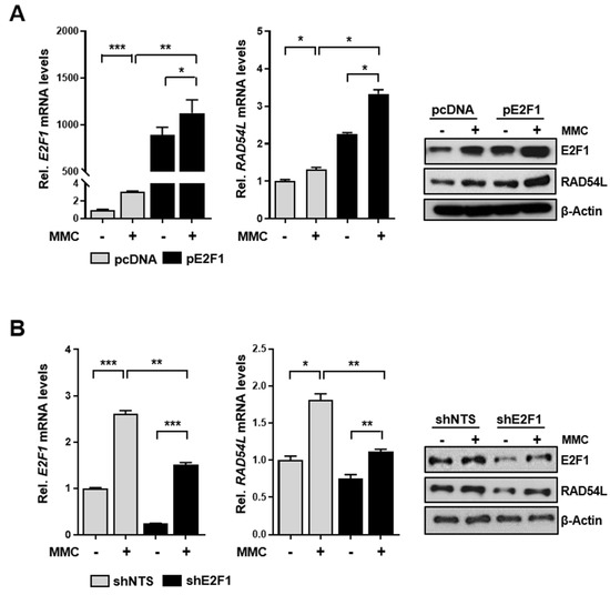 E2F1 overexpression plasmid (pE2F1) was constructed based on previous studies [47]. RAD54L overexpressing plasmid (pRAD54L) was also prepared similarly. Primer sequences used to prepare plasmid constructs are listed in Table S1. Transfection was carried out using a jetPRIME reagent of 1:3 according to the manufacturer’s protocol [48]. Gene expression at 24 h post-transfection was normalized to that of corresponding empty vector. Mitomycin C (MMC) and puromycin were dissolved in distilled water and stocked at 1 mM and 5 mg/mL (M4287, P8833; Sigma, Shiga, Japan), respectively.