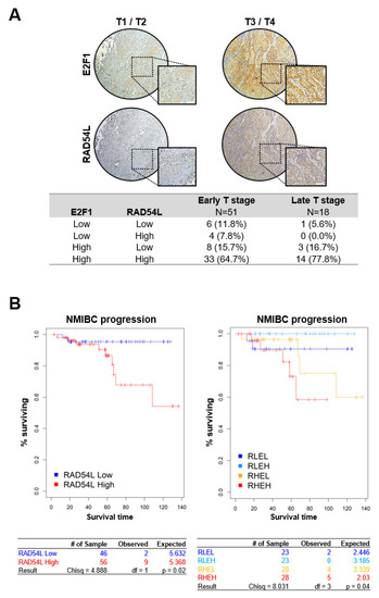 Tissue microarrays (TMAs) were used to determine the role of high expression levels of E2F1 and RAD54L in cancer progression and poor prognosis of bladder cancer patients. As shown in Figure 6A, the protein levels of E2F1 and RAD54L were significantly higher in the tissue samples of patients with T3/T4 (late T stage) than in patients with T1/T2 (early T stage) (Figure 6A). These results showed that the expression levels of these two genes were related to cancer progression.