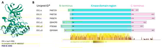 (A) Visualization of human CK1ε crystal structure in complex with PF-4800567 bound in the adenosine triphosphate (ATP)-binding pocket. The structure screenshot is based on the PDB 4HNI [] entry from the RCSB PDB (rcsb.org) []. (B) Conserved regions visualization. Multiple alignment was produced by ClustalOmega, the conserved regions present in the kinase domain were visualized by Jalview 2.11.0. * Canonical variant; aa—amino acid.