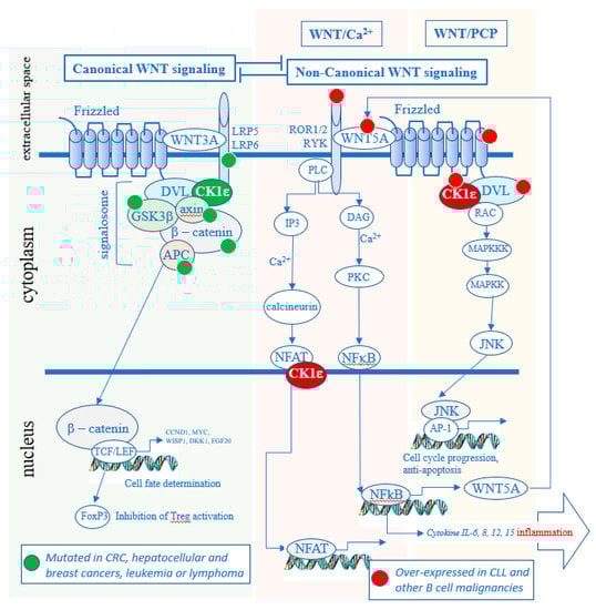 Role of CK1δ/ε in the Wnt signaling pathways. In the canonical pathway, it maintains the signalosome active and blocks the degradation of β-catenin. In the non-canonical pathway, CK1δ/ε kinase activity leads to the activation of the Wnt/Ca2+ and Wnt/PCP pathways. Many oncogenic mutations in the canonical pathway are found in solid tumors (green dots) [,,,,], whereas many over-expressions of oncogenes are present in hematologic cancers (red dots) [,,,,]. CRC—colorectal cancer.