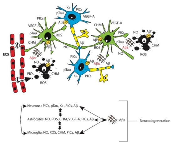 A still largely held view posits that in human AD the astrocytes behave as competent phagocytes tasked with cleaning up cellular debris and Aβ42 fibrils becoming overloaded with the latter in the process [63,64,65]. However, cortical nontumorigenic adult human astrocytes (NAHAs) exposed in vitro to fibrillary or soluble Aβ25–35, an Aβ42 proxy, de novo produce, accumulate, and release surpluses of Aβ42-os just like neurons do, while simultaneously decreasing their release of neurotrophic and neuroprotective soluble amyloid precursor protein-α (sAPP-α). Therefore, given their high numbers, the astrocytes can directly contribute to the amyloid brain overload proper of AD [33,66]. In addition, each astrocyte envelops with its mobile processes the so-called tripartite synapses of several neurons [67,68]. In addition, distinct astrocytes envelop with their processes the synapses of a single neuron. In this way, extended groups of neurons are functionally joined to regulatory astrocytes, while the latter are reciprocally interconnected via gap junctions that allow for the quick diffusion of Ca2+ waves [69]. Regulatory astrocytes also promote the formation and stabilization of their neurons’ synapses by mopping up released K+ ions and glutamate. They modulate the neuronal release of neurotransmitters by secreting their own gliotransmitters [70] and via Ca2+ releases and uptakes during their Ca2+ waves [69]. Importantly, astrocytes’ processes also envelope cerebral microvessels and affect the local blood flow and oxygen supply to support the functions of their metabolically dependent neurons [70]. An age-related acute or chronic local perfusion deficit and consequent brain tissue hypoxia can cause the accumulation and release of newly produced neurotoxic sAβ-os from both neurons and astrocytes [71]. This engenders vicious feed-forward cycles that stimulate the de novo surplus production and release of further amounts of sAβ-os, p-Tau-os, NO, VEGF-A, proinflammatory cytokines and chemokines, and other neurotoxic agents (Figure 1) [13,15,33,66].