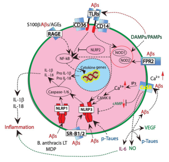 A schematic representation of some of the main PRRs and their signaling pathways involved in AD’s neuroinflammation. The cell represented could belong to any neural cell type. Aβs, soluble and/or fibrillar amyloid-β peptides; FPR2, formyl peptide receptor 2; IP3, inositol triphosphate; LT, lethal toxin; ↑, upregulation; ↓, downregulation. For further details and abbreviations see the text.