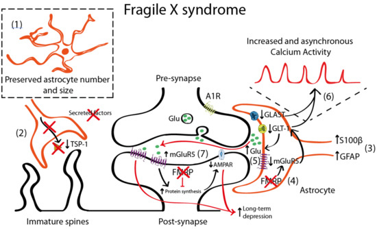 Schematic representation illustrating the astrocyte-synapse alterations in Fragile X syndrome (FXS). (1) Astrocyte number is preserved. (2) Reduced astrocyte secreted thrombospondin (TSP-1) prevents spine maturation resulting in more abundant filopodia (immature) spines. (3) Increased S100 calcium-binding protein β (S100β) and GFAP expression has been described in astrocytes. However, this altered expression has not been directly linked with their activity or function. (4) Fragile X Mental Retardation Protein (FMRP) absence in FXS astrocytes leads to metabotropic glutamate receptor 5 (mGluR5) downregulation in astrocytes (yet not in neurons) that negatively regulates glutamate transporter 1 (GLT-1) expression. Impaired glutamate transport due to decreased astrocyte glutamate-aspartate transporter 1 (GLAST-1) and GLT-1 expression increases extracellular glutamate levels (5) and astroglial calcium oscillations (6). This excess of glutamate might activate the postsynaptic mGluR5, which is overexpressed in neurons. (7) mGluR5 and FMRP oppositely regulate mRNA translation at the synapse: mGluR5 promotes it and FMRP prevents it. Therefore, increased mGluR5 expression and lack of FMRP in FXS leads to a disbalance in protein expression levels that account for many of the syndromic features of FXS including an α-amino-3-hydroxy-5-methyl-4-isoxazolepropionic acid receptor (AMPAR) internalization that leads to an exaggerated mGluR5-mediated long-term depression (LTD) that is reported in Fmr1 knock-out (KO) mice.