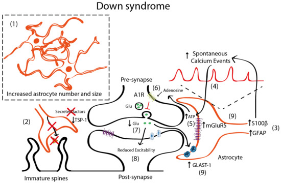 Schematic representation illustrating the astrocyte-synapse alterations in DS. (1) Astrocyte number and volume is increased in DS. (2) Reduced astrocyte secreted TSP-1 prevents spine maturation resulting in more frequent filopodia (immature) spines. (3) Increased S100β and GFAP expression has been described in astrocytes. S100β upregulation has been linked with increased astrocyte calcium oscillations (4). Increased astrocyte activity leads to adenosine triphosphate (ATP) release to the synaptic cleft (5) that is hydrolyzed to adenosine and activates A1 adenosine receptors (A1R) (6). A1R activation prevents glutamate release from the presynaptic terminal and, consequently (7) depresses synaptic transmission (8). Even though mGluR5 is upregulated in astrocytes (and probably in neurons), no mechanistic studies have been performed to uncover the contribution of mGluR5 to DS pathophysiology. (9) Reduced glutamate concentrations can be contributed by increased expression of the glutamate transporter GLAST-1 that leads to increased astroglial glutamate uptake.