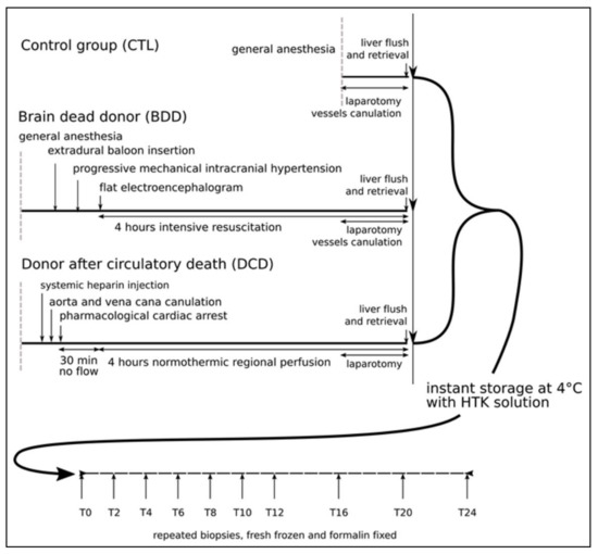 Experimental set-up: The control group (CTL) consisted in a laparotomy followed by liver removal. The brain death donor group (DBD) demonstrated a flat electroencephalogram as a result of cranial hypertension and was followed by resuscitation for 4 h. The donation after circulatory death group (DCD) began with the insertion of cannulas into the aorta and vena cava, then was euthanized during anesthesia by potassium overdose and followed by a 4-h regional normothermic circulation. The three types of graft were subsequently flushed and conditioned according to the same protocol at 4 °C with repeated biopsies allowing for further analysis. Five animals were used in each group (n = 5).
