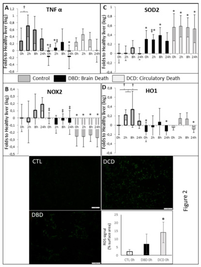 Presence of reactive oxygen species (ROS) was assayed on liver samples collected at time of collection (Figure 2, Bottom). We detected a minimal amount of signal in CTL (less than 3%) and a moderate induction of ROS production in DBD livers (7%). The highest levels of ROS production were detected in DCD samples, reaching 14% (p < 0.05 to CTL).